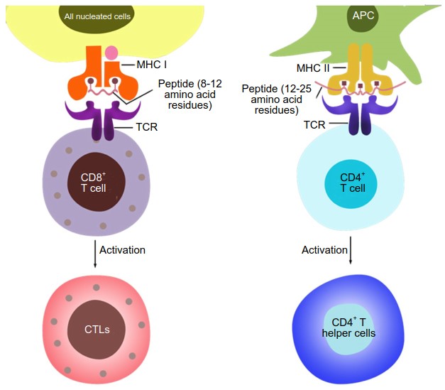 这种T细胞触发的检测限非常低(4个pMHC/TCR集群),事实上,体内104个呈递肽中,绝大多数属于正常“自我”肽,只有少数外来抗原。MHC分子和T细胞分为两个亚型组。MHC I类分子(MHC-I)通常在所有有核细胞中表达,并呈递细胞内(内源)抗原片段。CD8+T细胞识别pMHC-I复合物,然后活化,分化为具有直接细胞杀伤能力的细胞毒性T细胞(CTL)。MHC II类分子(MHC-II)在“专职性”抗原呈递细胞(APC),如DC细胞中表达,并提呈被APC吞噬的外源抗原。CD4+T细胞识别pMHC-II复合物,并分化为辅助性T细胞,激活其它免疫系统成分。
