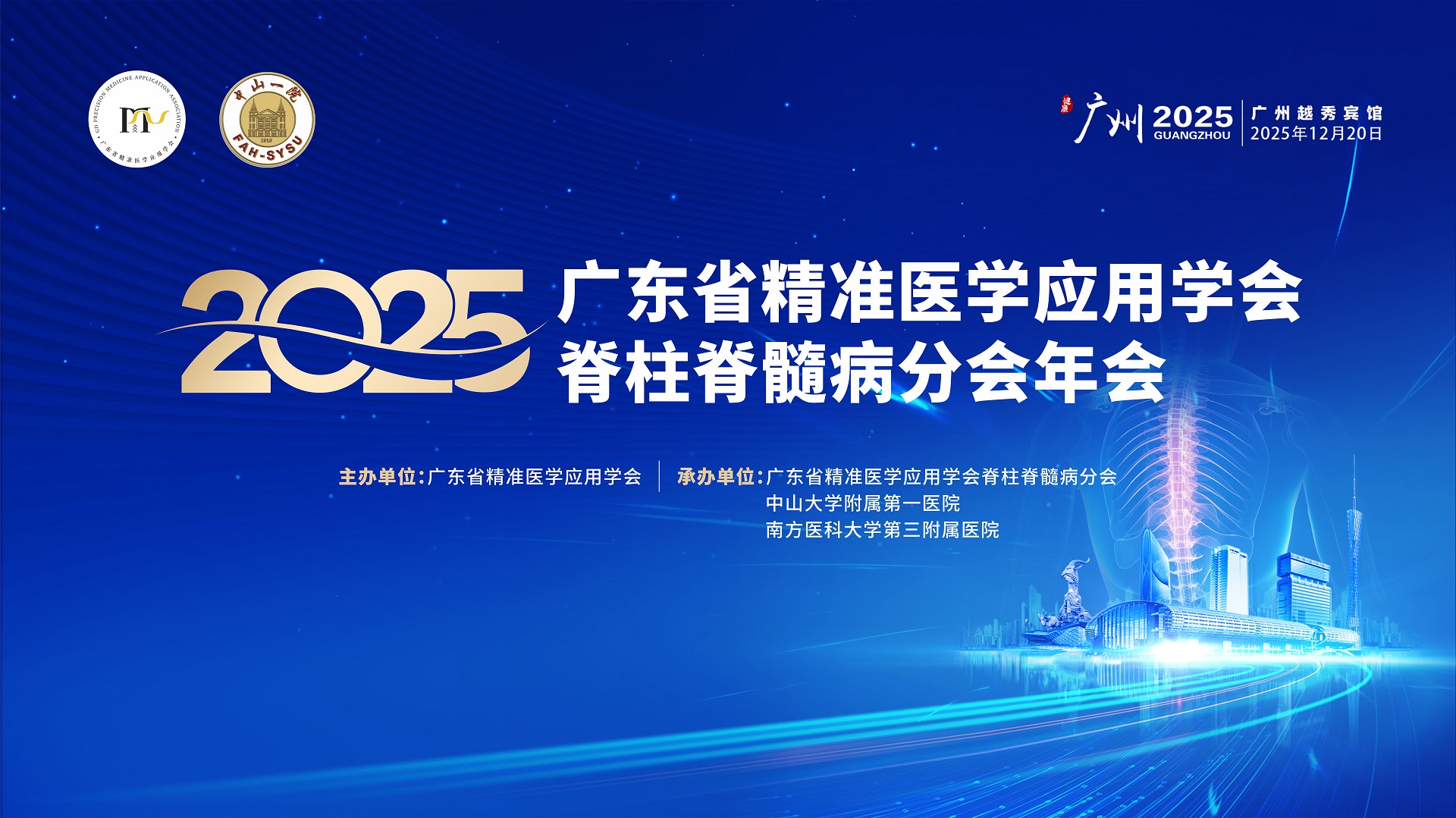 由广东省精准医学应用学会主办,广东省精准医学应用学会脊柱脊髓病分会、中山大学附属一医院、南方医科大学第三附属医院共同承办的“2025广东省精准医学应用学会脊柱脊髓病分会年会”,将在2025年12月20日在广州举办。会议将邀请国内外脊柱外科精准医学应用领域专家作专题报告,促进跨领域、多学科交流、合作,共同推进脊柱外科技术的研究和临床应用。现将有关事项通知如下: