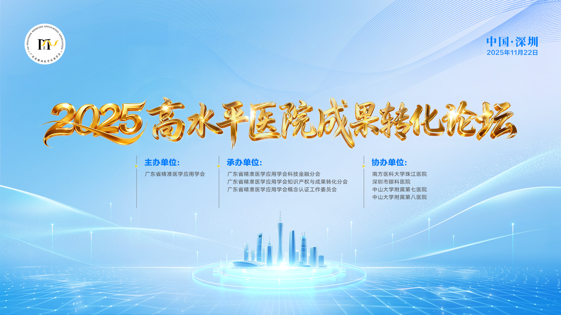 为服务创新驱动发展,促进高水平医院成果转化高质量发展,助力生物医药强省建设,由广东省精准医学应用学会主办,南方医科大学珠江医院、深圳市眼科医院、中山大学附属第七医院、中山大学附属第八医院共同协办,学会科技金融工作委员会、知识产权与成果转化分会、概念认证工作委员会承办的“2025高水平医院成果转化论坛”将于2025年11月22日在深圳市举办。