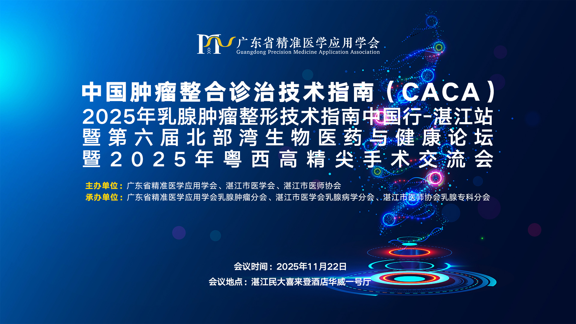 由广东省精准医学应用学会、湛江市医学会、湛江市医师协会联合主办,广东省精准医学应用学会乳腺肿瘤分会、湛江市医学会乳腺病学分会、湛江市医师协会乳腺专科分会承办,广东医科大学附属医院协办的“中国肿瘤整合诊治技术指南(CACA)-2025年乳腺肿瘤整形技术指南中国行-湛江站暨第六届北部湾生物医药与健康论坛暨2025年粤西高精尖手术交流会暨广东省癌症中心乳腺癌规范诊疗一体化质控会议湛江站暨乳腺肿瘤精准治疗多学科协作研讨会”计划于2025年11月22日在粤西湛江举办,并同期举行“2025年湛江市医学会乳腺病学分会年会”。本次会议拟邀请来自省内省外各地多位业内著名专家参会,会议规模150人。