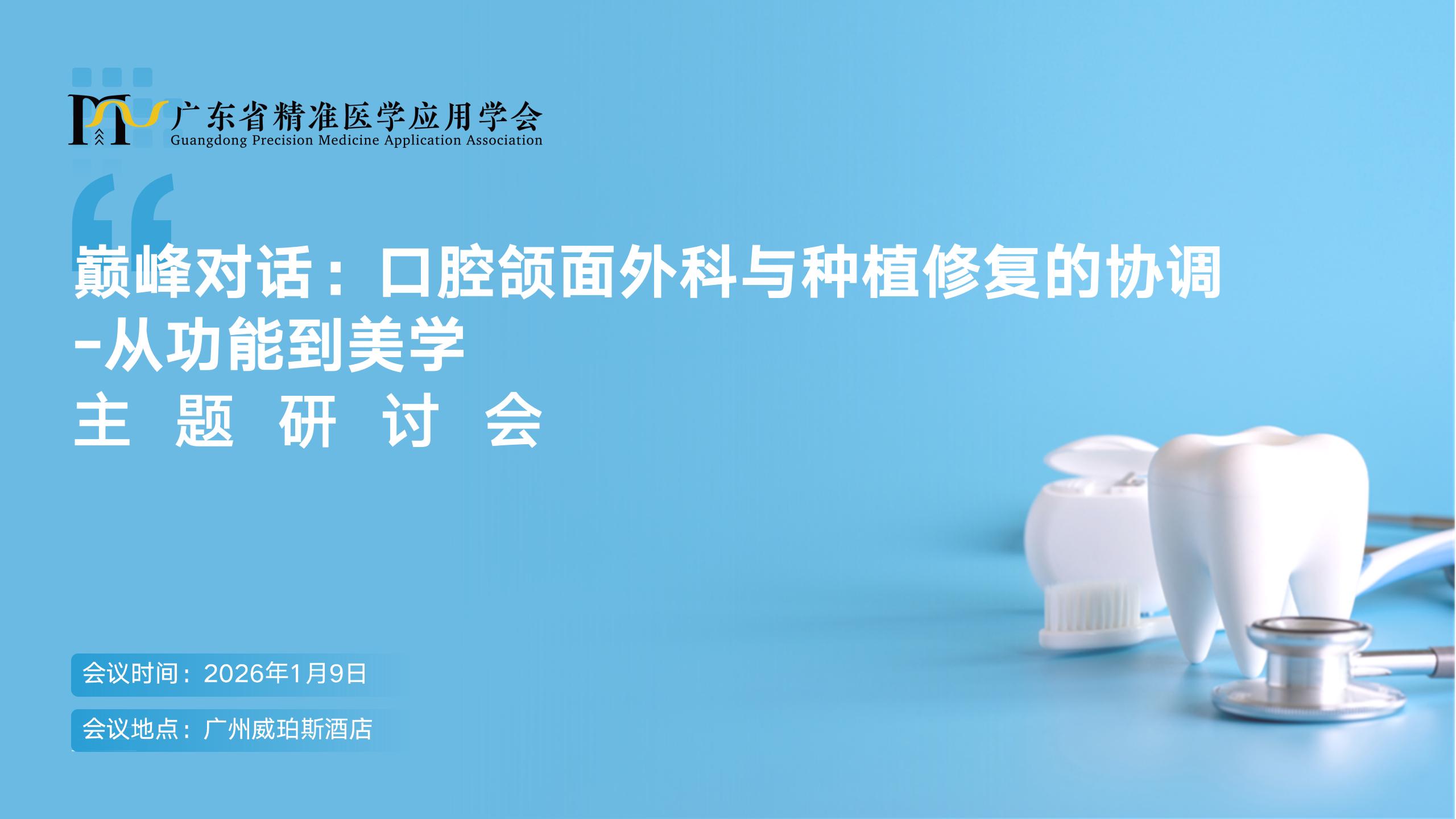 加强口腔颌面外科与种植修复领域的精准医学应用与学术交流,提升临床技术水平,由广东省精准医学应用学会主办,口腔修复种植分会承办的“‘巅峰对话:口腔颌面外科与种植修复的协调-从功能到美学’主题研讨会”将于2026年1月9日广州举办。
