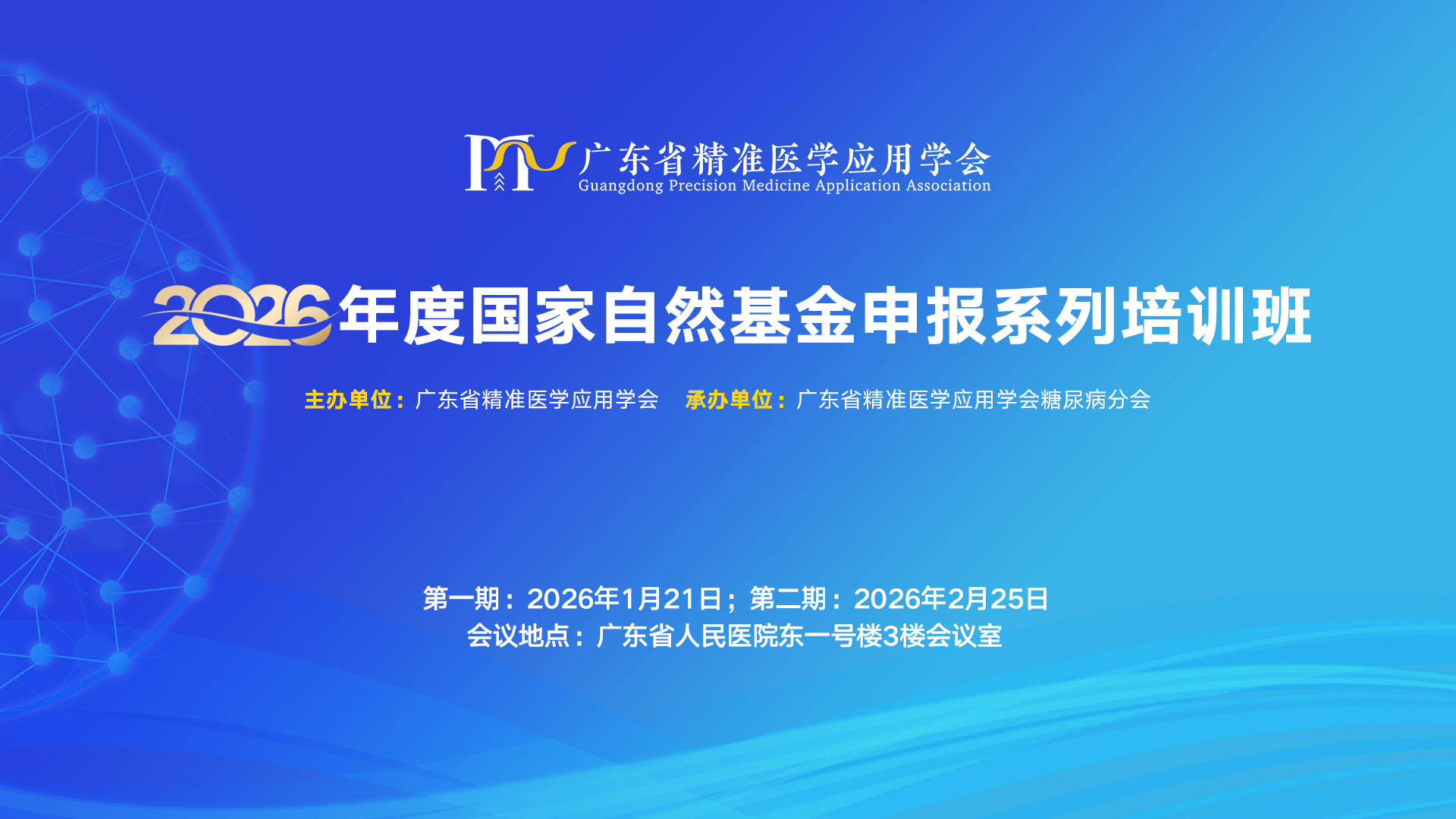 推动医院基础研究发展,进一步做好国家自然科学基金申报准备工作,提升申请书质量和水平,提高申报项目的命中率,由广东省精准医学应用学会主办、广东省精准医学应用学会糖尿病分会承办的“2026年度国家自然基金申报系列培训班”,将于2026年1月-2月在广州举办2期培训,每期现场培训规模50人。现将有关事宜通知如下: