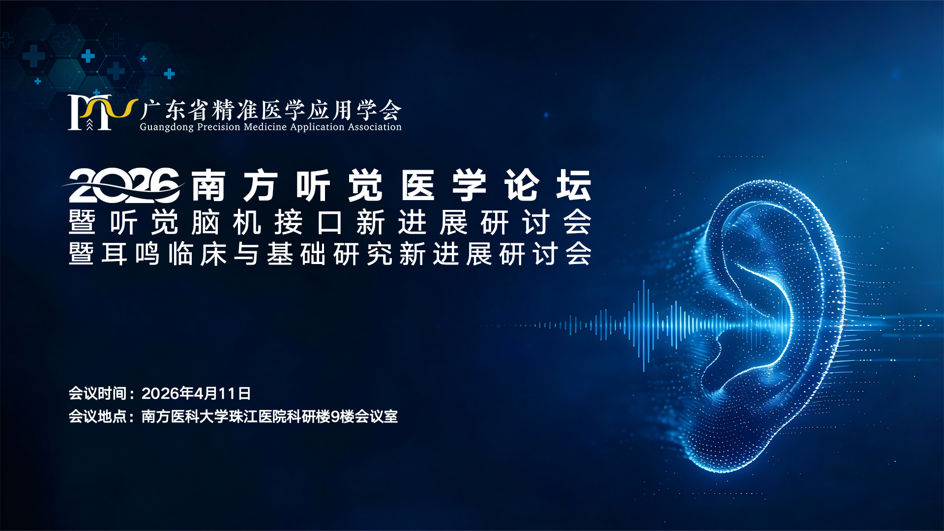 由广东省精准医学应用学会主办,南方医科大学珠江医院、听觉与前庭障碍分会承办的“2026南方听觉医学论坛暨听觉脑机接口新进展研讨会暨耳鸣临床与基础研究新进展研讨会”,计划于2026年4月11日在广州举行。本次论坛是听觉医学和基础研究领域的专题学术会议,名家荟萃、内容精彩,特邀国内外多位耳科和听力学权威专家就听觉相关前沿专题展开深入研讨。