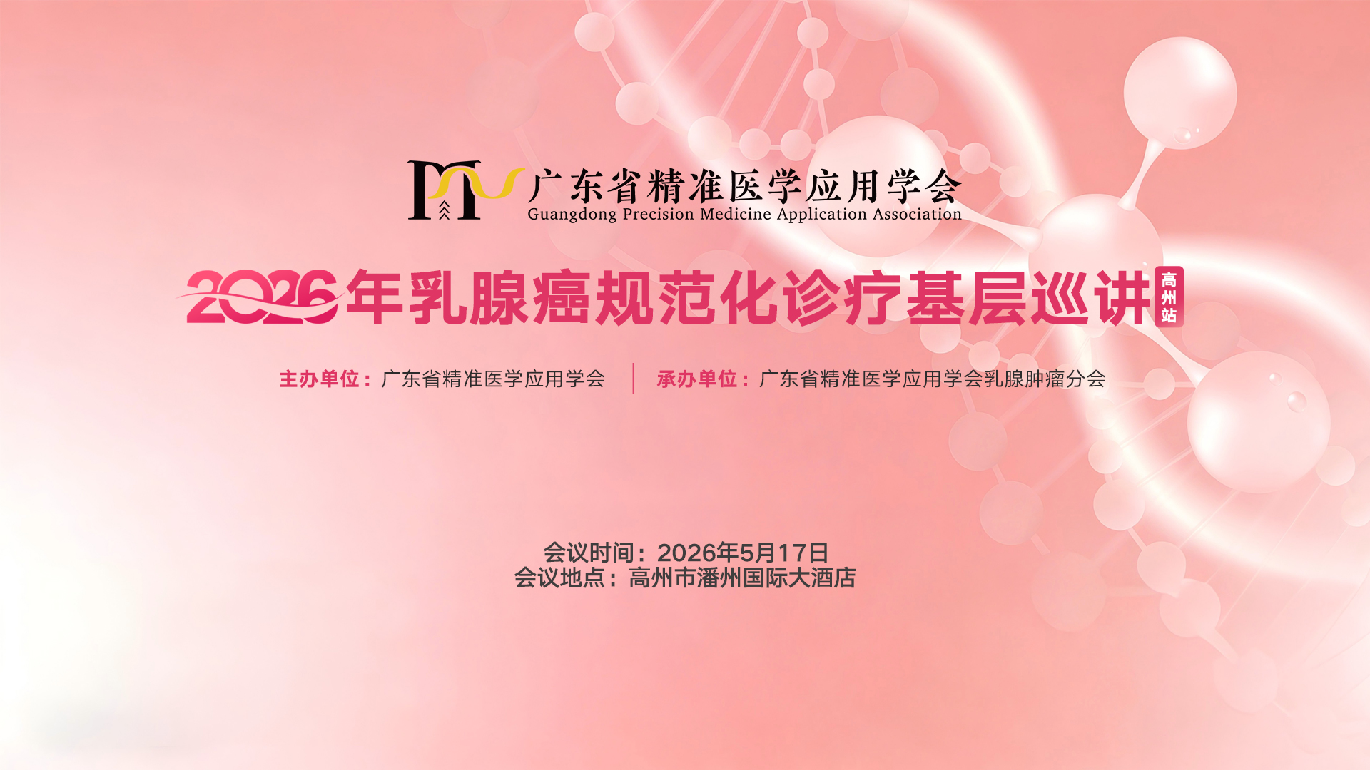 为了促进和加强乳腺病学科的建设,为各医疗卫生单位的学术交流、科研教学提供良好的平台,提高乳腺病学科的整体诊治水平,由广东省精准医学应用学会与高州市人民医院联合主办、乳腺肿瘤分会承办的“2026年乳腺癌规范化诊疗基层巡讲-高州站”将于2026年5月17日在茂名高州市举办,预计参会专家50余人。