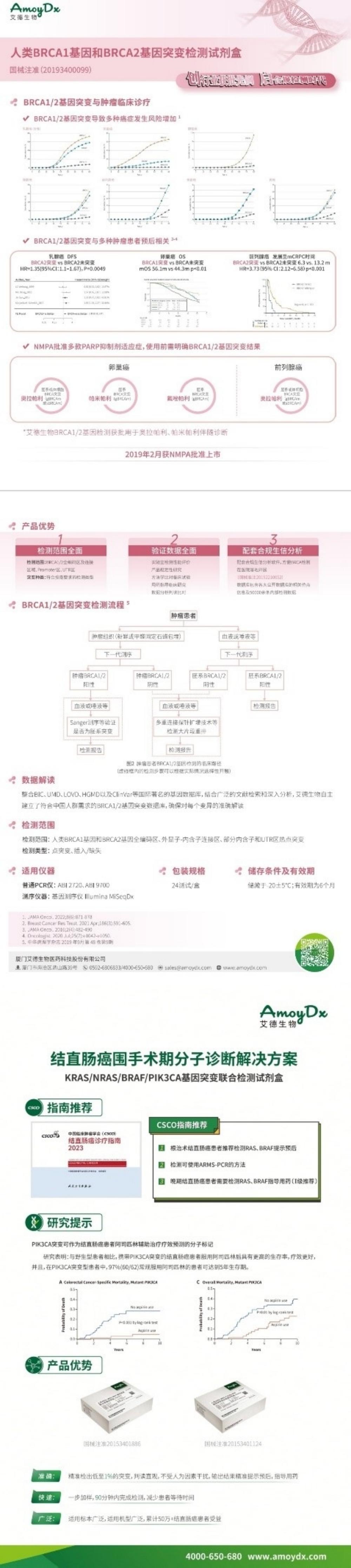 公司拥有国家企业技术中心、博士后科研工作站、发改委基因检测技术应用示范中心、国家高新技术企业、福建省肿瘤高通量测序工程研究中心等资质,GMP标准厂房获得国家药监局(NMPA)和欧盟ISO13485资质认证;公司拥有ADx-ARMS®、Super-ARMS®、ddCapture®、ADx-HANDLE®等核心技术,核心技术获得中国、美国、欧盟、日本授权,荣获国家科学技术进步奖二等奖、中国专利奖银奖;公司产品覆盖具备精准医疗条件的各大癌种,多个产品至今尚无竞品,除了在国内三甲医院大规模应用外,部分产品在日本、韩国获批上市并进入当地医保,开创了我国肿瘤伴随诊断海外获批的先例。此外,公司下设厦门艾德医学检验所、上海厦维医学检验所,拥有医疗机构执业许可证、通过美国病理学会(CAP)认证,专业从事第三方临检服务。目前全球数十个国家和地区的客户选择了艾德产品和服务,每年有数十万肿瘤患者从中受益,有效避免了肿瘤药物的误用滥用。公司瞄准行业创新源头,以伴随诊断赋能原研药物临床,是阿斯利康、强生、安进、礼来、默克、卫材、恒瑞、百济等国内外顶级药企肿瘤药物开发的战略合作伙伴,共筑肿瘤精准医疗的未来。